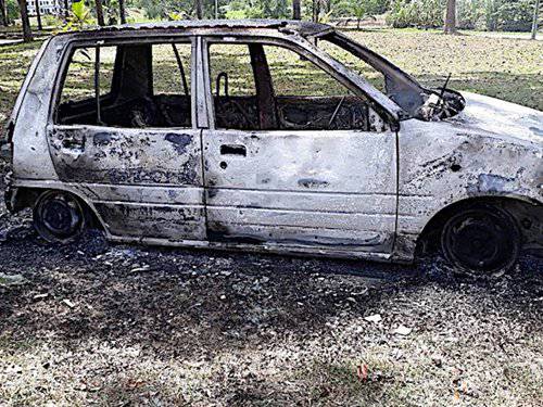 Mobil yang terbakar kini tampak seperti besi tua.